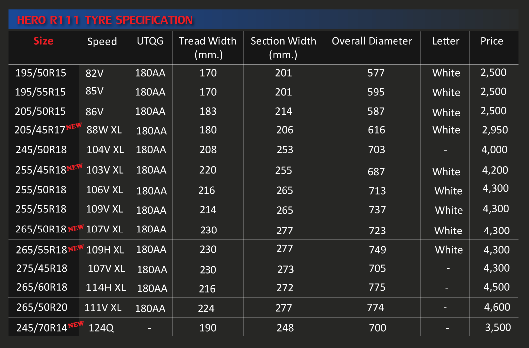 ค่า Tread wear 180 ทำให้ยางมีความนุ่มหนึบ และยืดหยุ่นสูงช่วยให้ยึดเกาะถนนในทุกสภาวะ ไม่ว่าจะเป็นถนนเปียก หรือแห้ง ช่วยเพิ่มความมั่นใจทุกการเข้าโค้ง ผนวกกับเทคโนโลยีการออกแบบสไตล์ asymmetrical ทำให้ HERO R111 คือ ยางซิ่ง น้องใหม่ที่สามารถตอบโจทย์ให้กับรถคุณได้เป็นอย่างดี